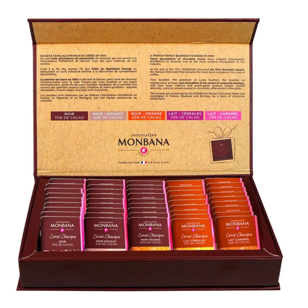Découvrez notre Coffret de 50 carrés classiques, proposant une délicieuse sélection de 5 saveurs exquises : noir 70%, noir nougat, noir orange, lait céréales et lait caramel.