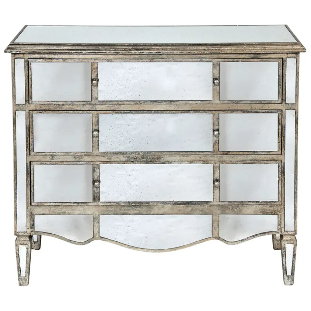 Cette commode marie le bois patiné et le verre pour offrir un meuble au style résolument vénitien.