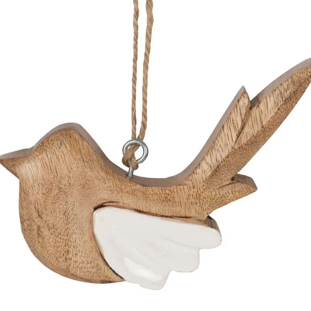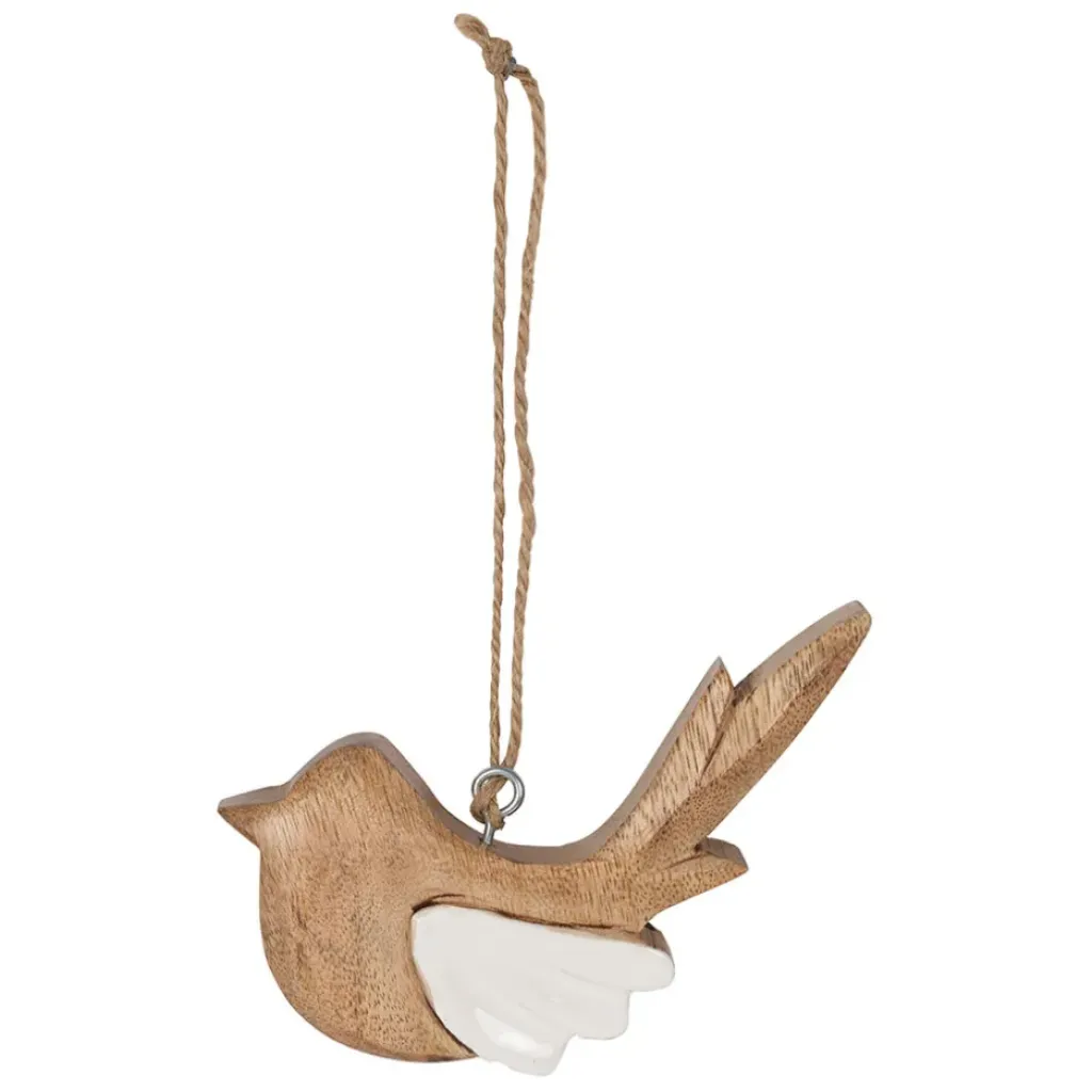 Découvrez notre superbe décoration suspendue en manguier naturel et blanc, représentant un moineau.