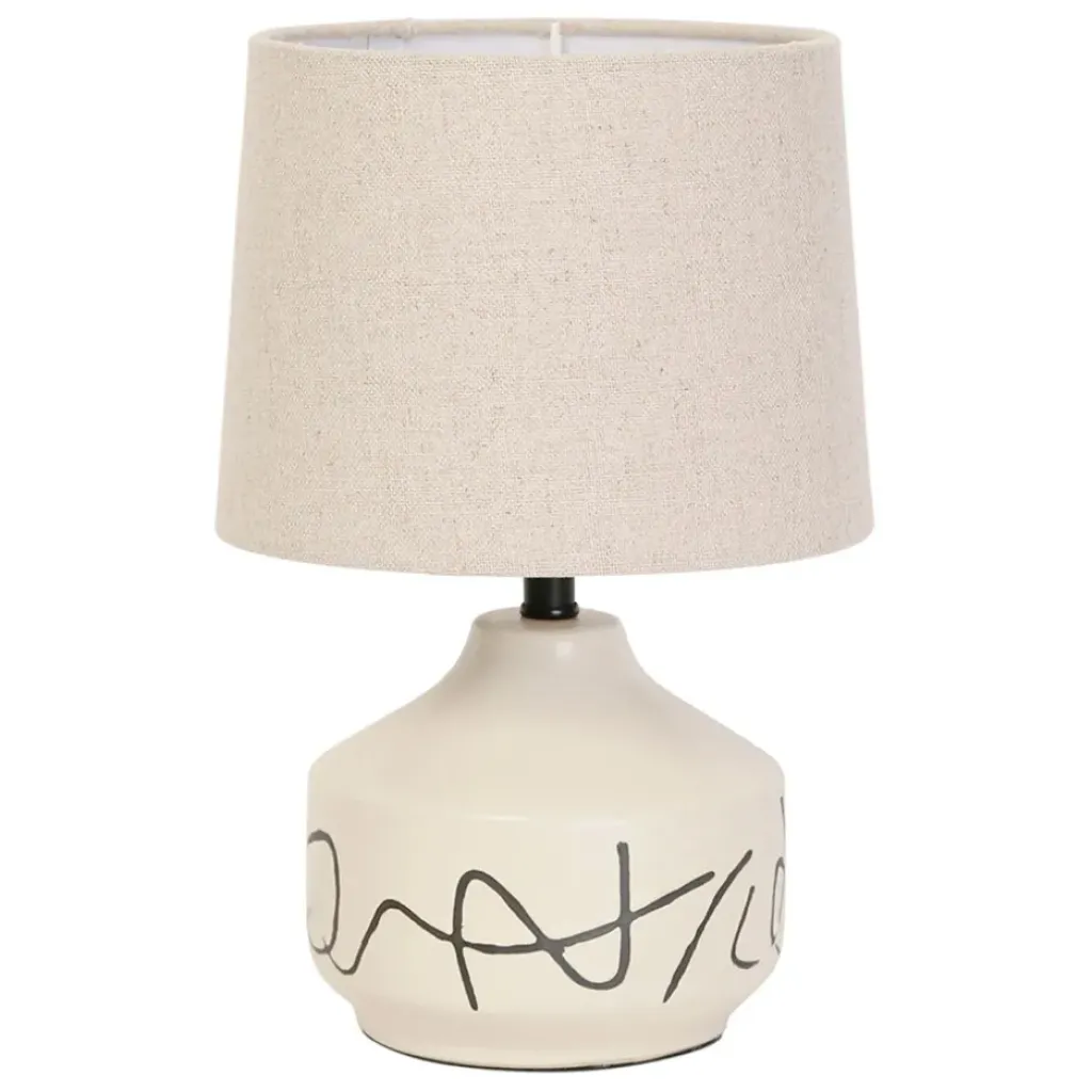 Lampe visionnaire en porcelaine et lin de couleur beige, mesurant 33cm de hauteur. Offrez-vous un éclairage élégant et contemporain pour illuminer votre intérieur.CRÉATION UNIQUE