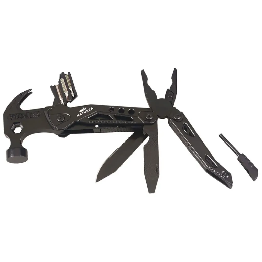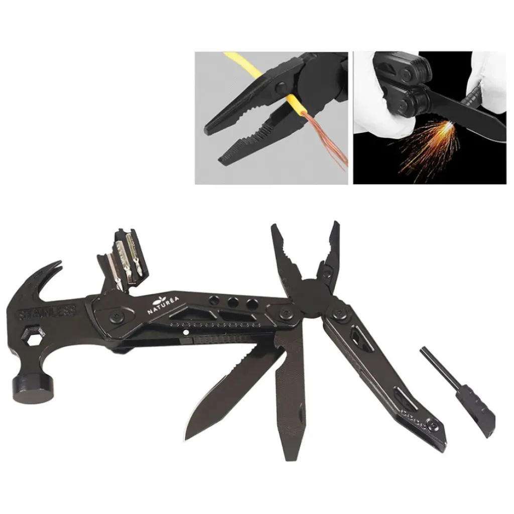 Composants de fonction : Pince, Coupe-fils professionnel, Dénudeur, Lame de couteau demi-dentelée, Lime & Tournevis plat & Ouvre-bouteille, Allume-feu, Sifflet de survie, Marteau, Clé hexagonale, 3 embouts, Porte-embout. 3).