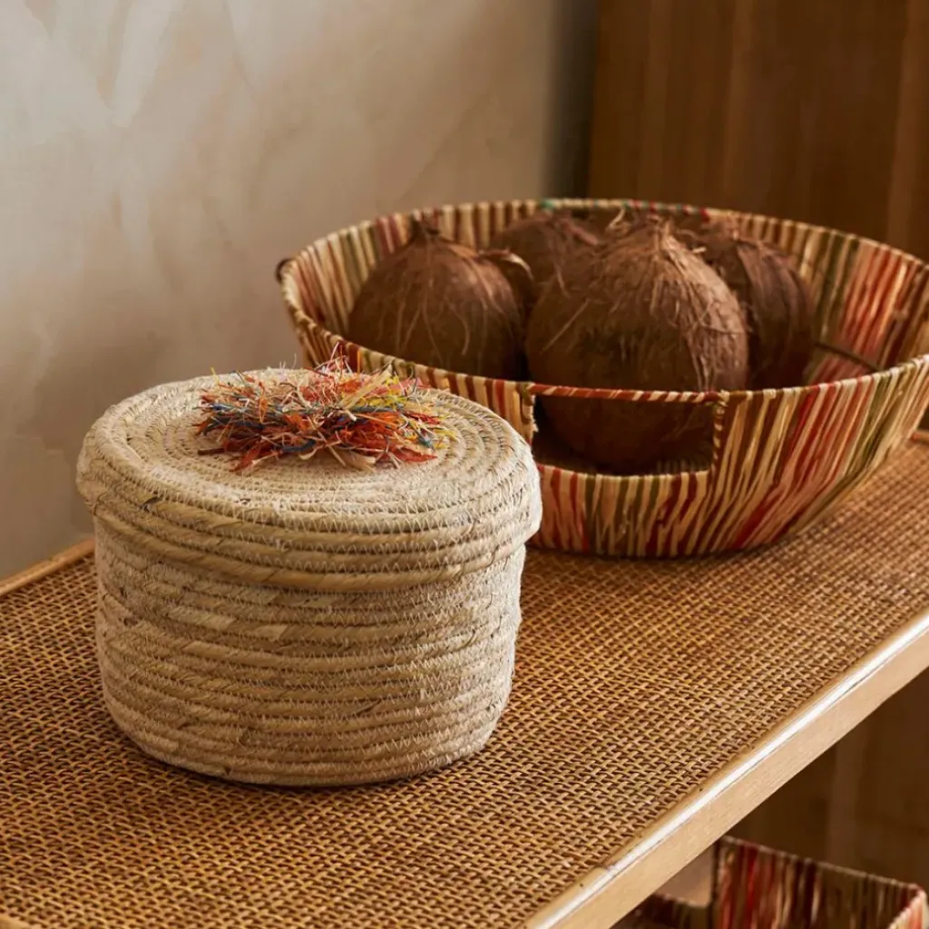 rSa conception en raphia et rotin multicolore confère à ce panier un charme authentique et chaleureux.