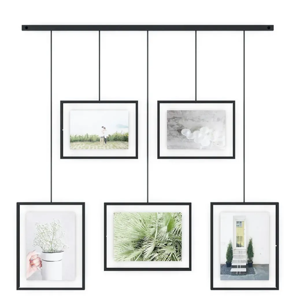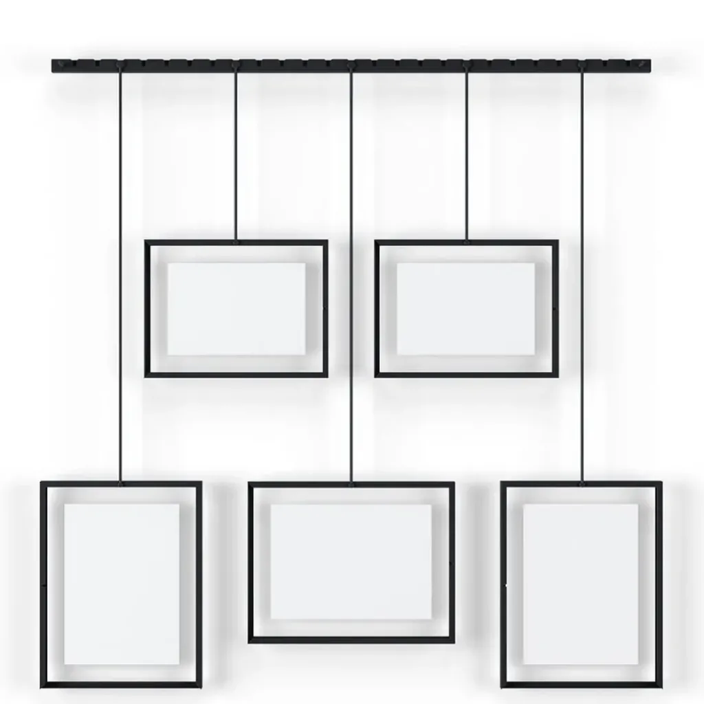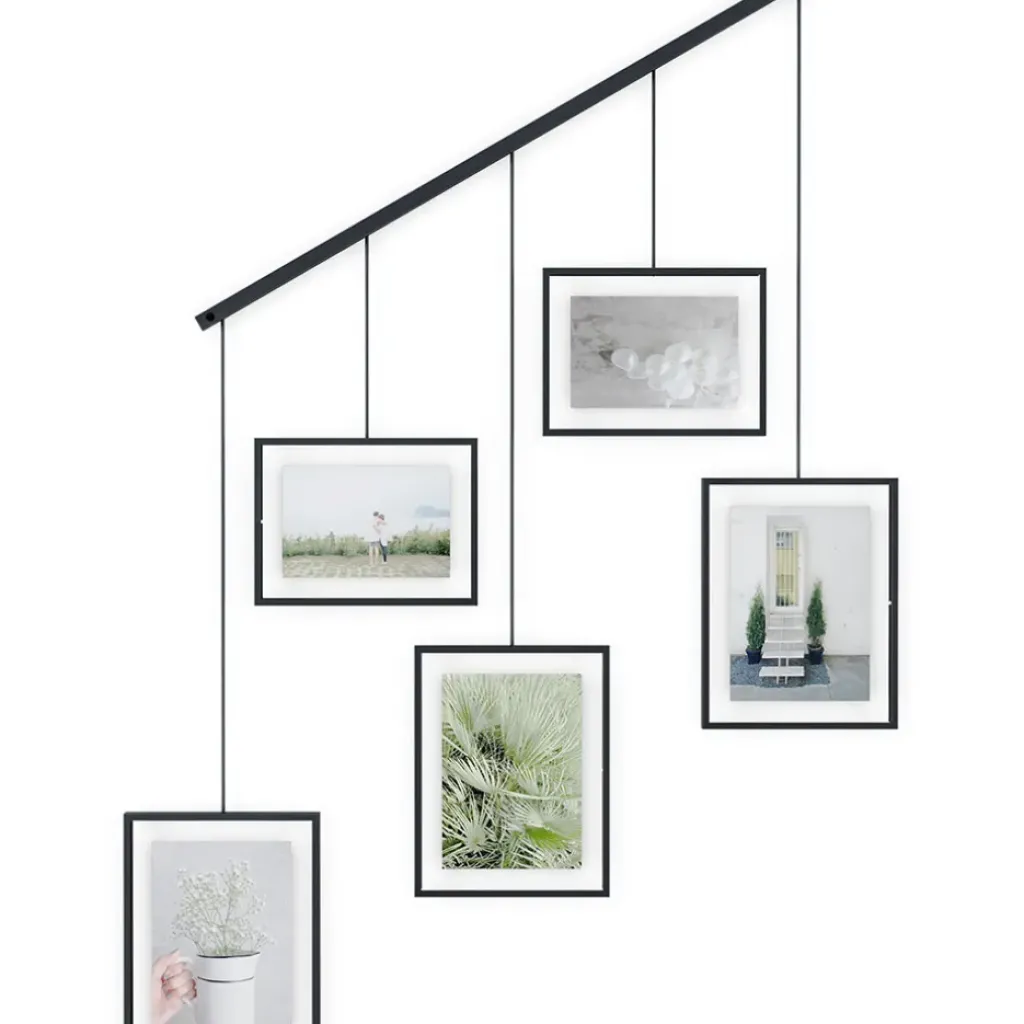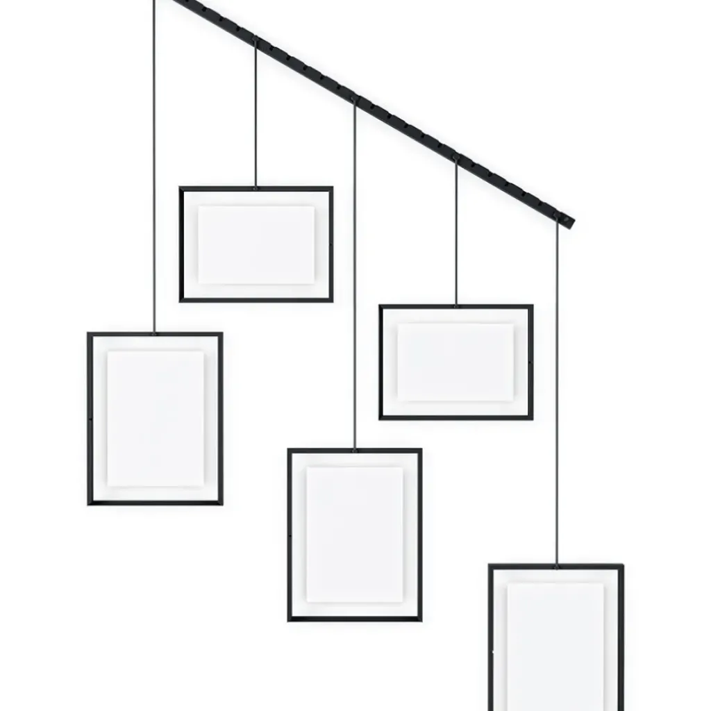 PRESENTATION ADAPTABLE : Chaque photo peut être interchangée en déplacant la tige sur la barre horizontale. La barre verticale peut elle même être suspendue inclinée de facon à suivre la pente d’un escalier ou d’une sous pente de toit.