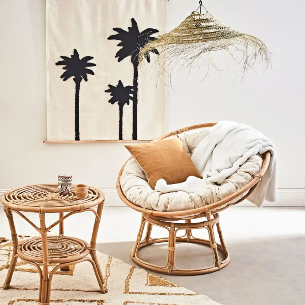 Fabriquée à partir de fibres d’osier tressées, cette suspension crée un éclairage tamisé et doux qui diffuse une ambiance apaisante dans la pièce.