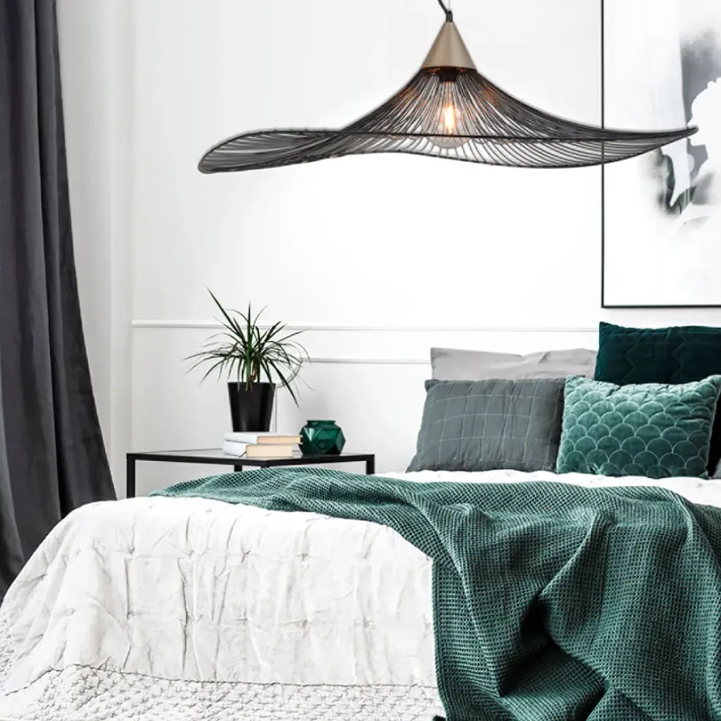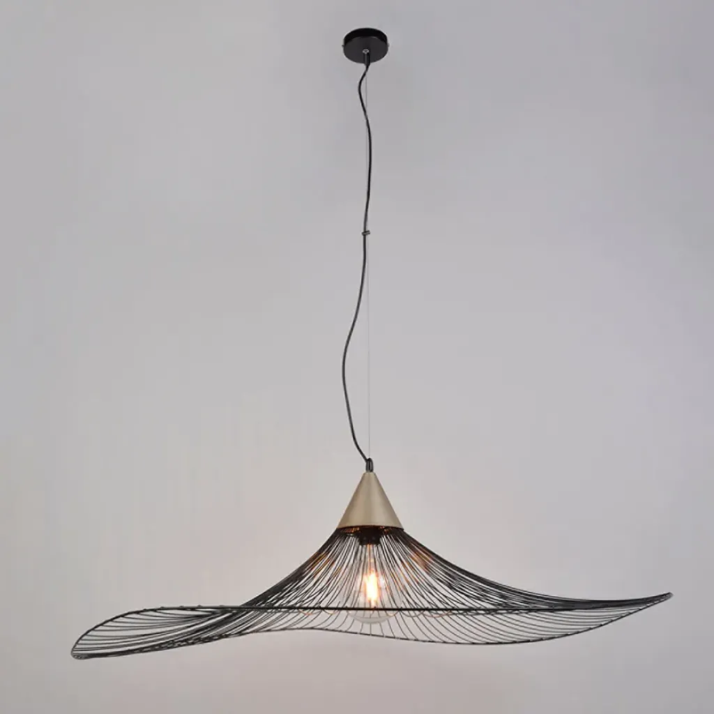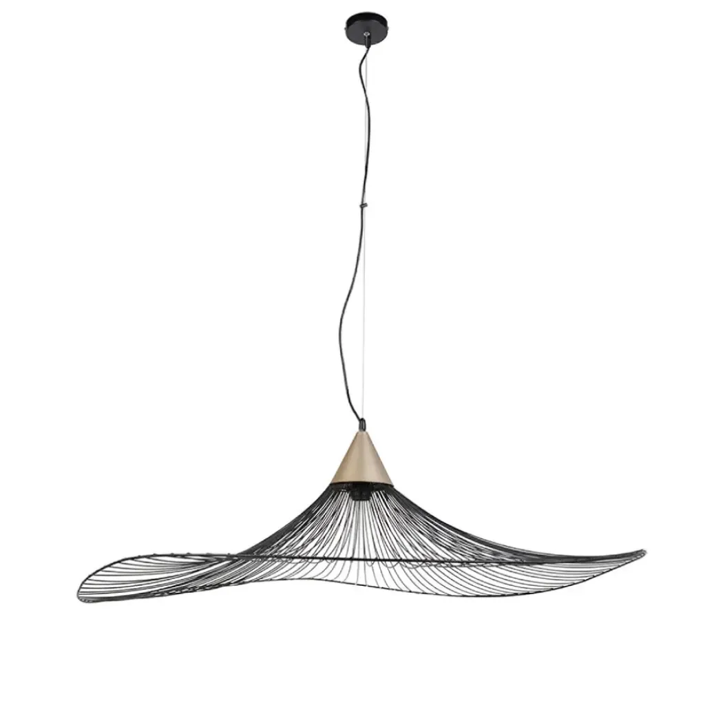 Suspension en métal filaire. Vendue avec cordelière électrique et pavillon métal peint. H138-D110cmCéramique + rotin
