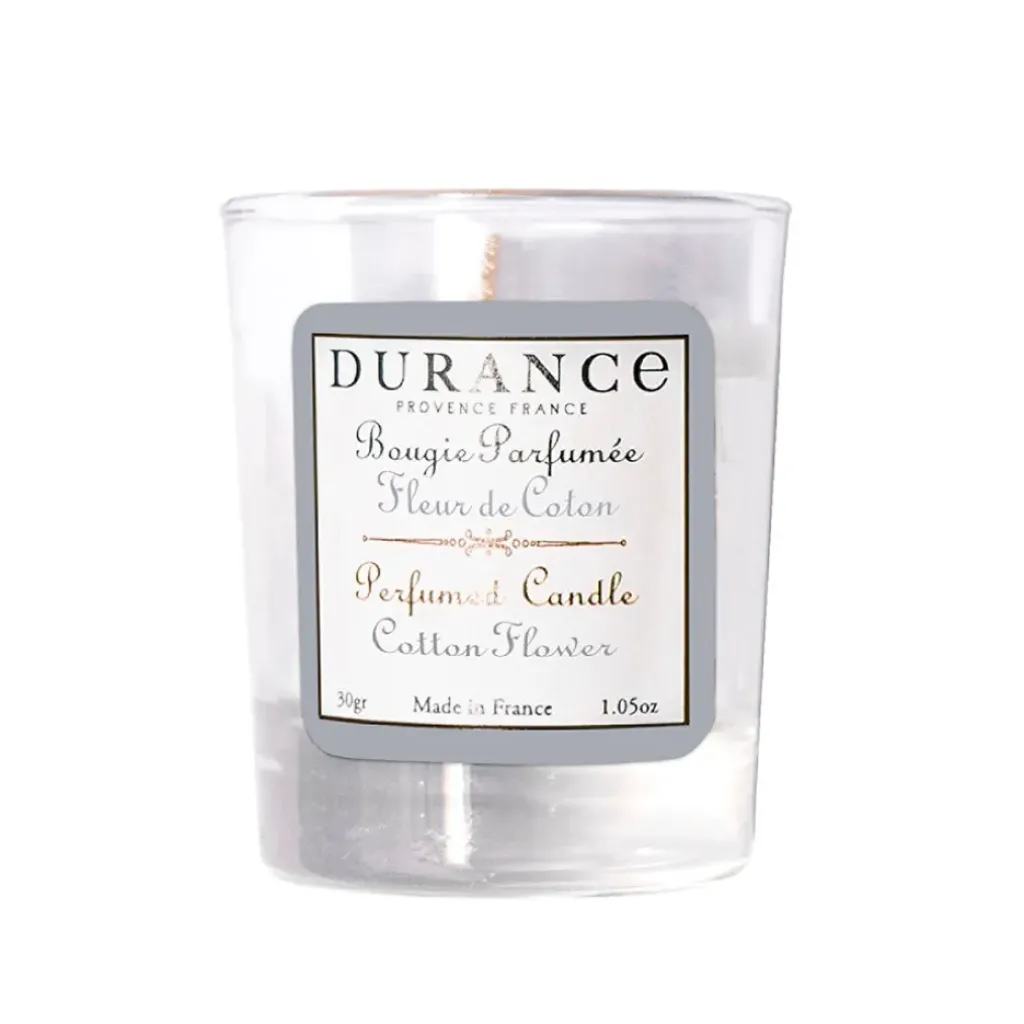 La bougie naturelle parfumée « Fleur de Coton » de 30g offre une expérience olfactive délicate et une lueur chaleureuse pendant environ 12 heures.