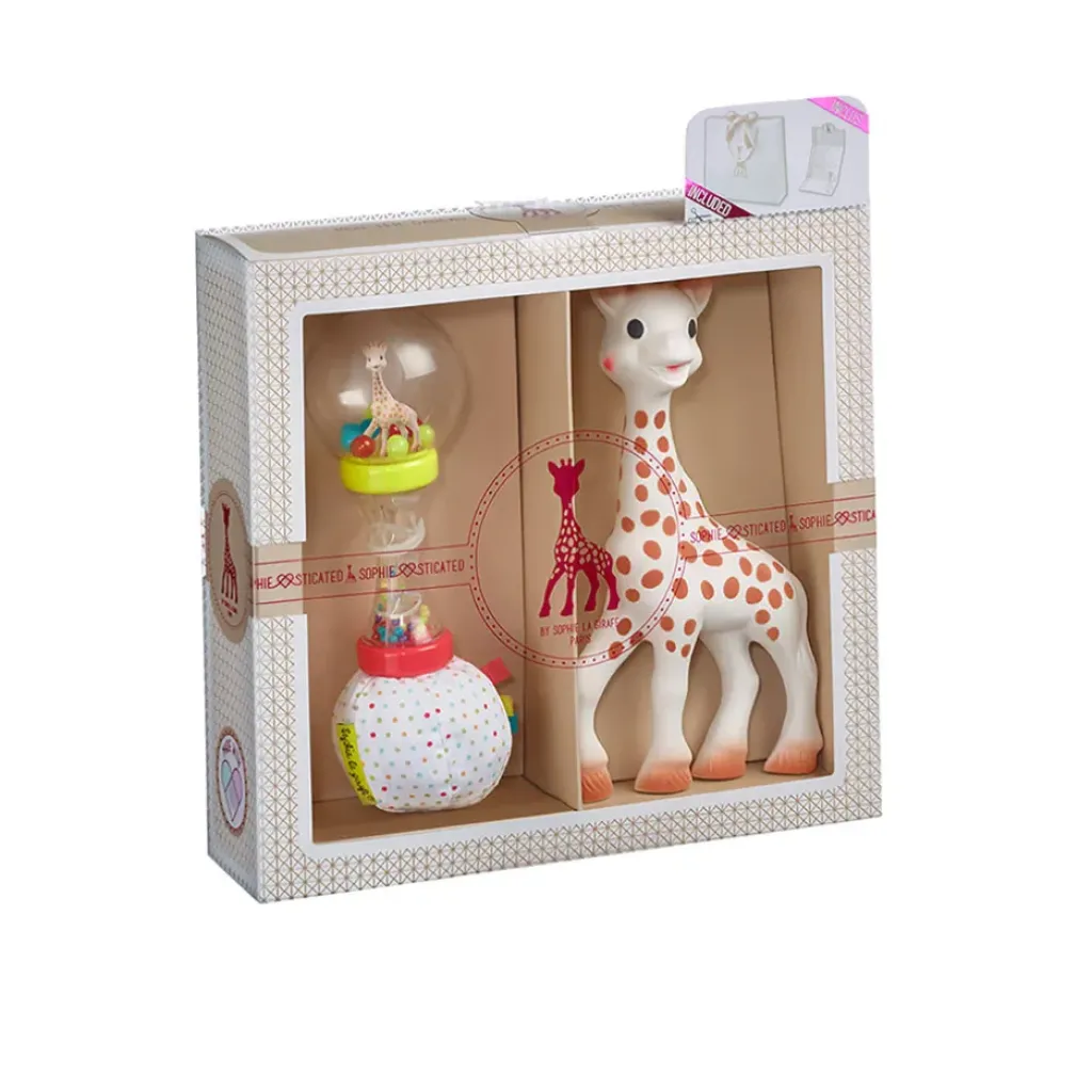 Comprend: Sophie la girafe: le premier jouet de bébé qui met tous ses sens en éveil : la vue, l’ouïe, le goût, le toucher, l’odorat.