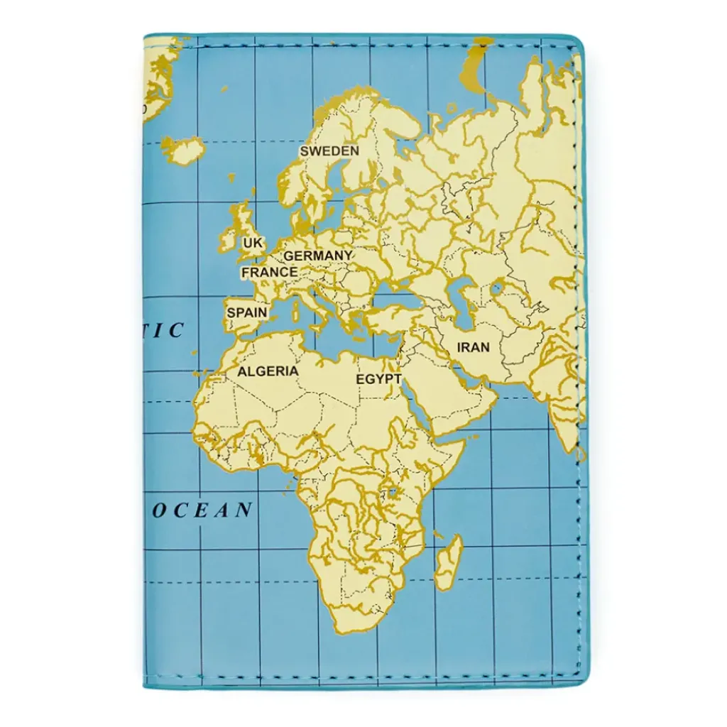 Voyagez avec style et praticité grâce à cet étui de passeport inspiré de la carte du monde.