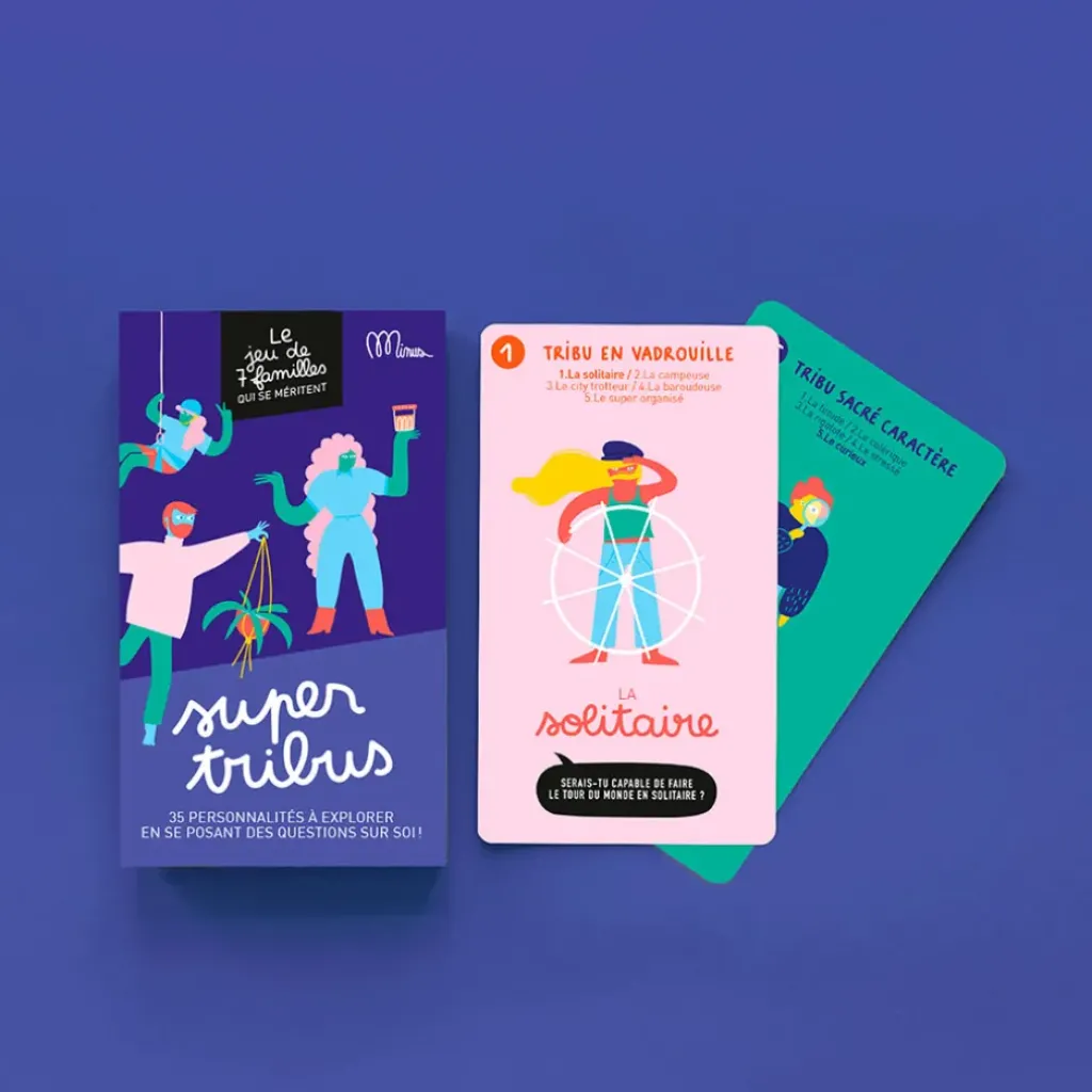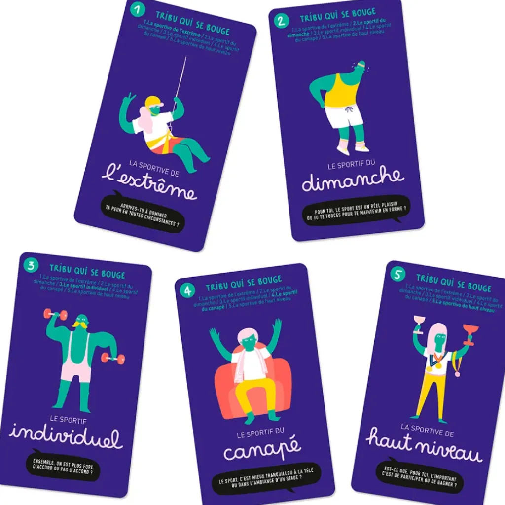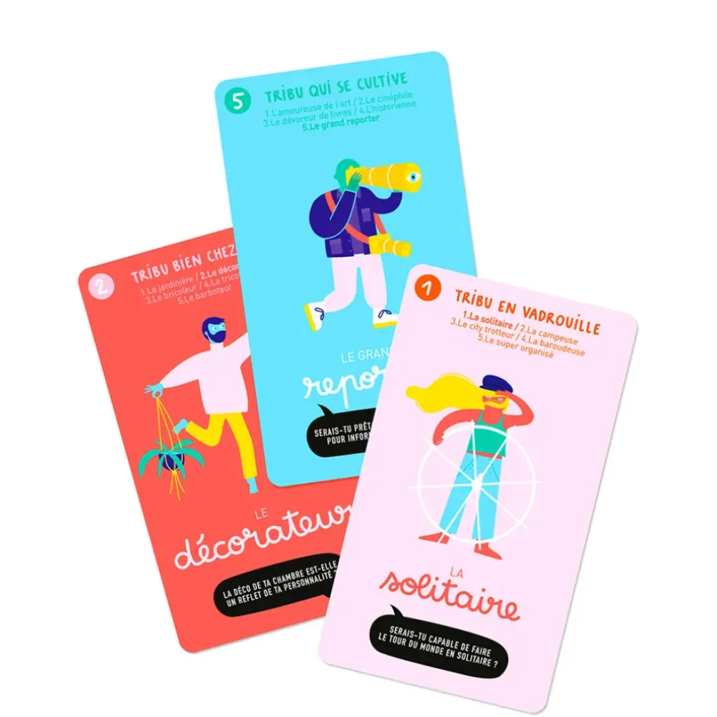 LA TRIBU « BIEN CHEZ SOI » – LA TRIBU « BON APPÉTIT » – LA TRIBU « EN VADROUILLE » – LA TRIBU « QUI SE BOUGE » – LA TRIBU « QUI SE CULTIVE » – LA TRIBU « SACRÉ CARACTÈRE » – LA TRIBU « VIVE LA PLANÈTE ».Ce jeu est conçu à Lille et est fabriqué en partie en France et en partie chez nos voisins belges.