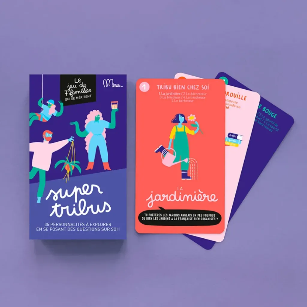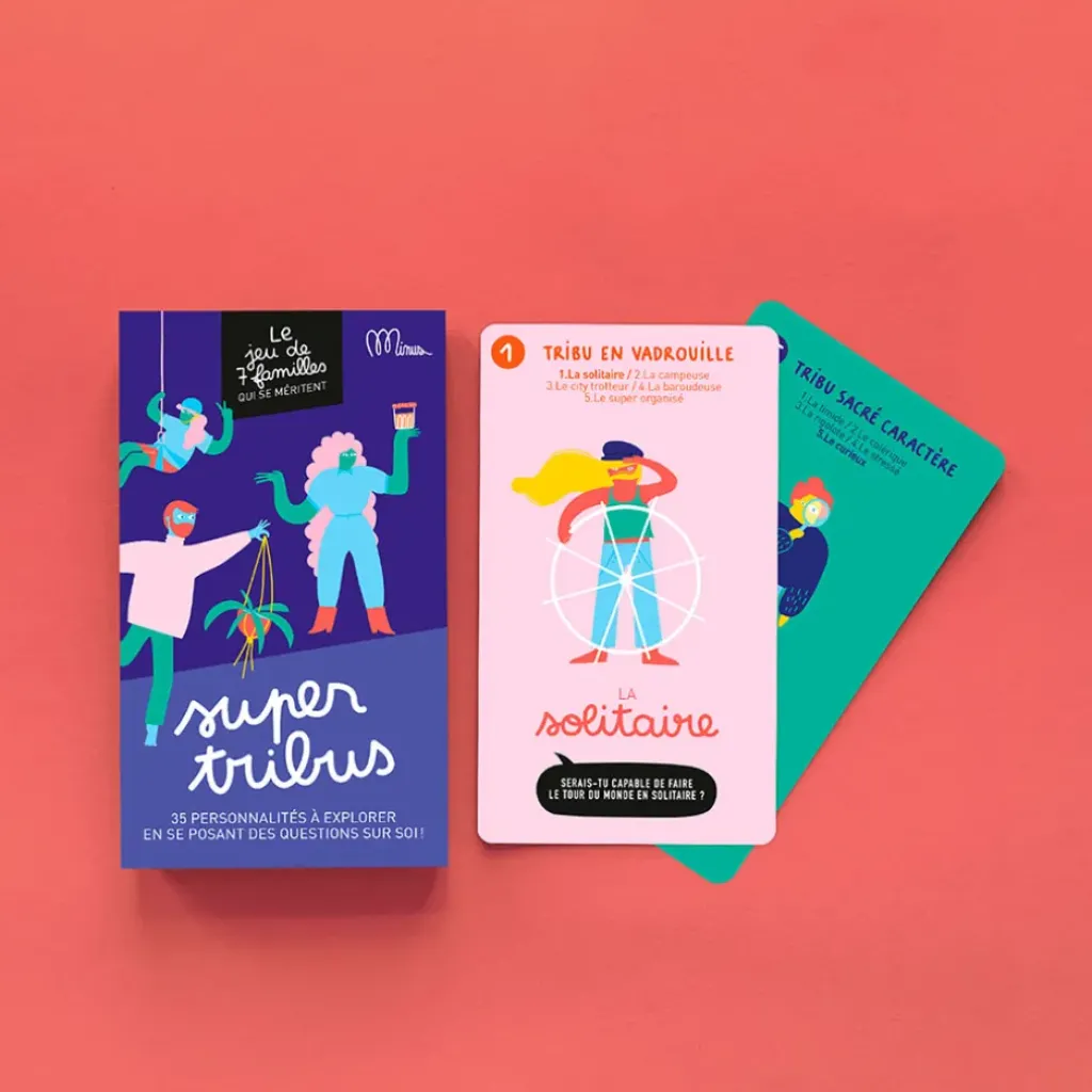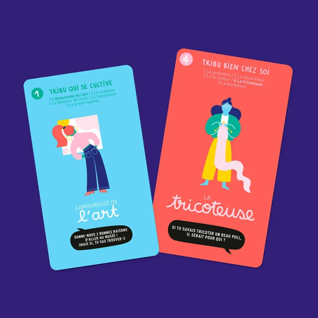 LA TRIBU « BIEN CHEZ SOI » – LA TRIBU « BON APPÉTIT » – LA TRIBU « EN VADROUILLE » – LA TRIBU « QUI SE BOUGE » – LA TRIBU « QUI SE CULTIVE » – LA TRIBU « SACRÉ CARACTÈRE » – LA TRIBU « VIVE LA PLANÈTE ».Ce jeu est conçu à Lille et est fabriqué en partie en France et en partie chez nos voisins belges.