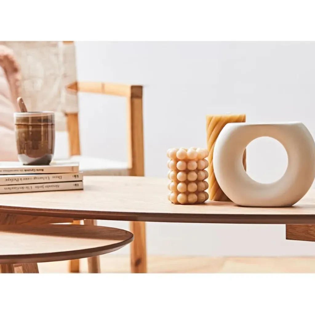 Découvrez la table basse gigogne en chêne naturel Becka, parfaite pour un salon à la décoration scandinave ou bohème.