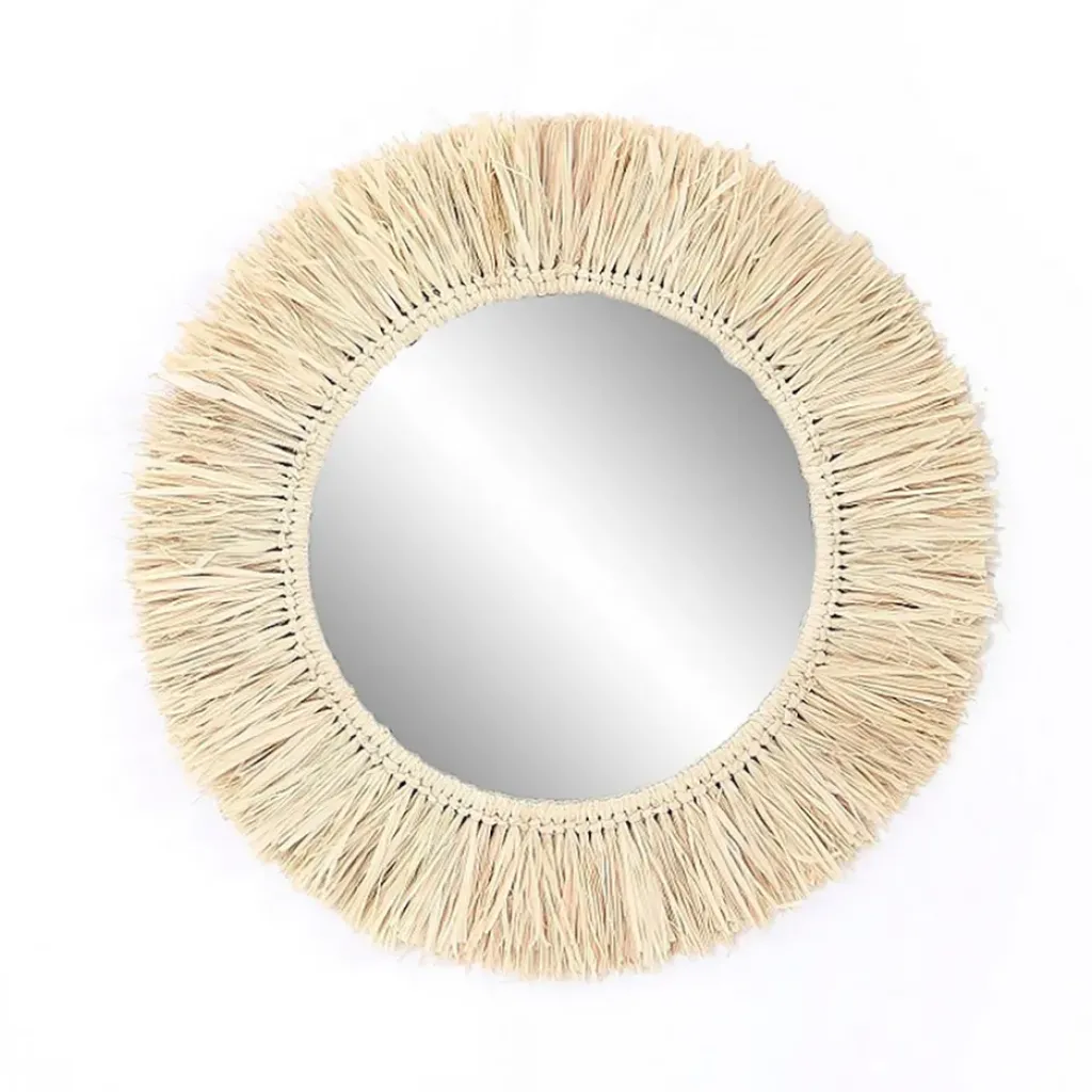 Voici un joli miroir rond avec des franges de raphia pour apporter une touche ethnique et naturelle à votre pièce.