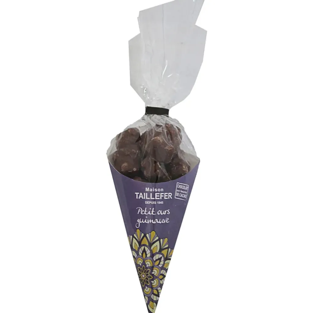 Découvrez notre cornet de 120g de nounours en guimauve, enrobé d’un irrésistible chocolat au lait.
