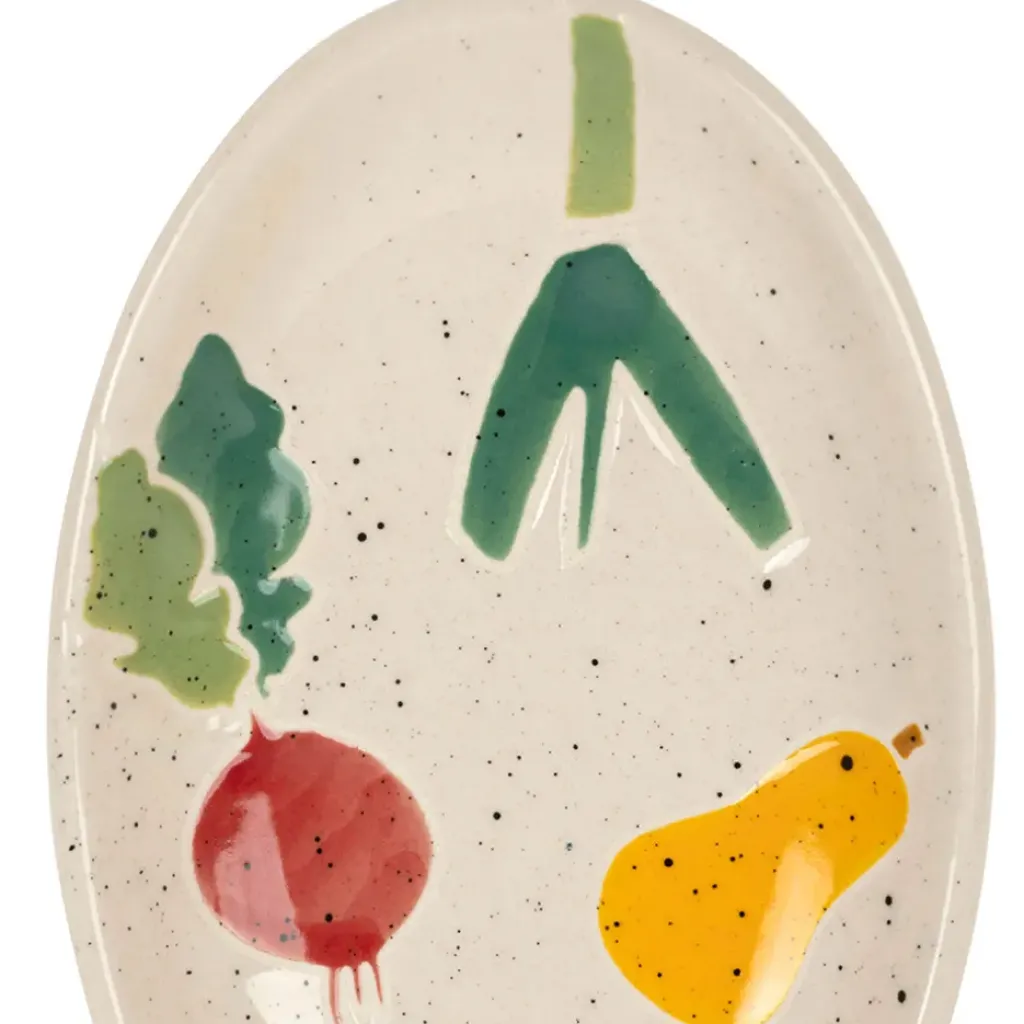 Ce support pour cuillère se distingue par son design original et coloré, illustrant différents légumes, ce qui apporte une touche unique et joyeuse à votre décoration de table.