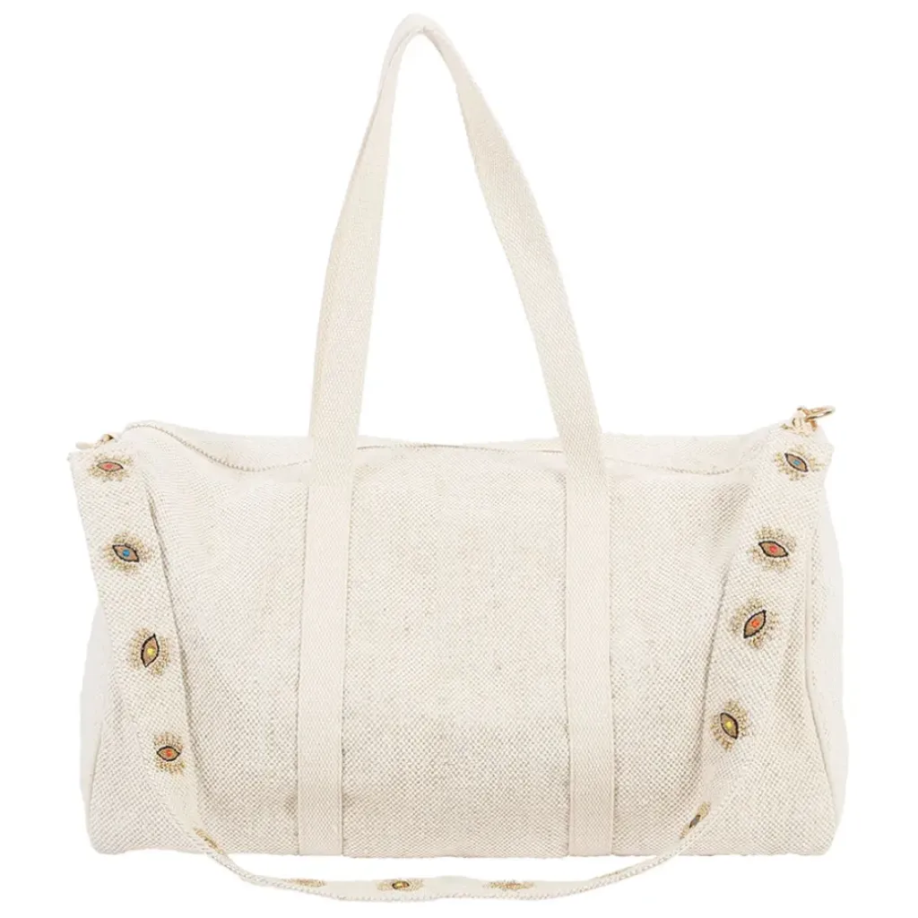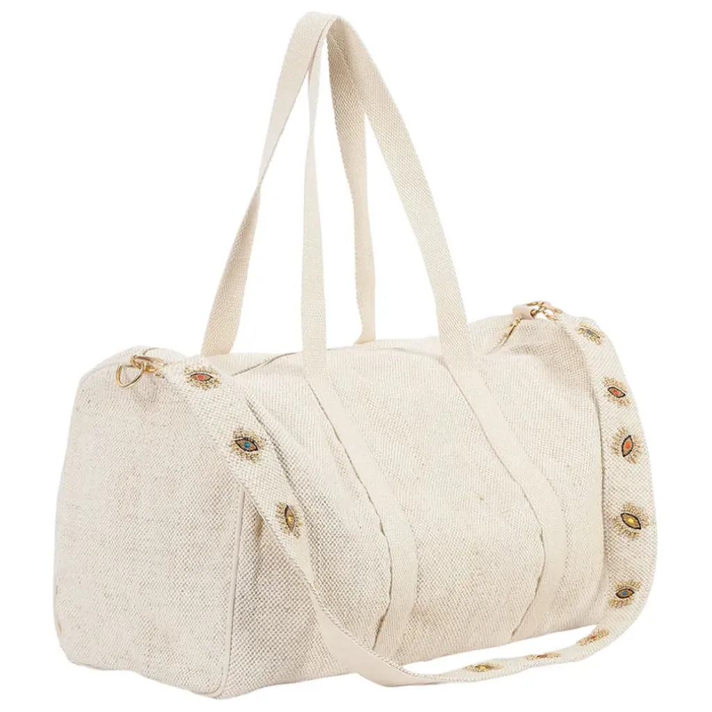 Découvrez le sac week-end Greeka en coton et jute écru et doré, un accessoire polyvalent qui allie style et praticité.