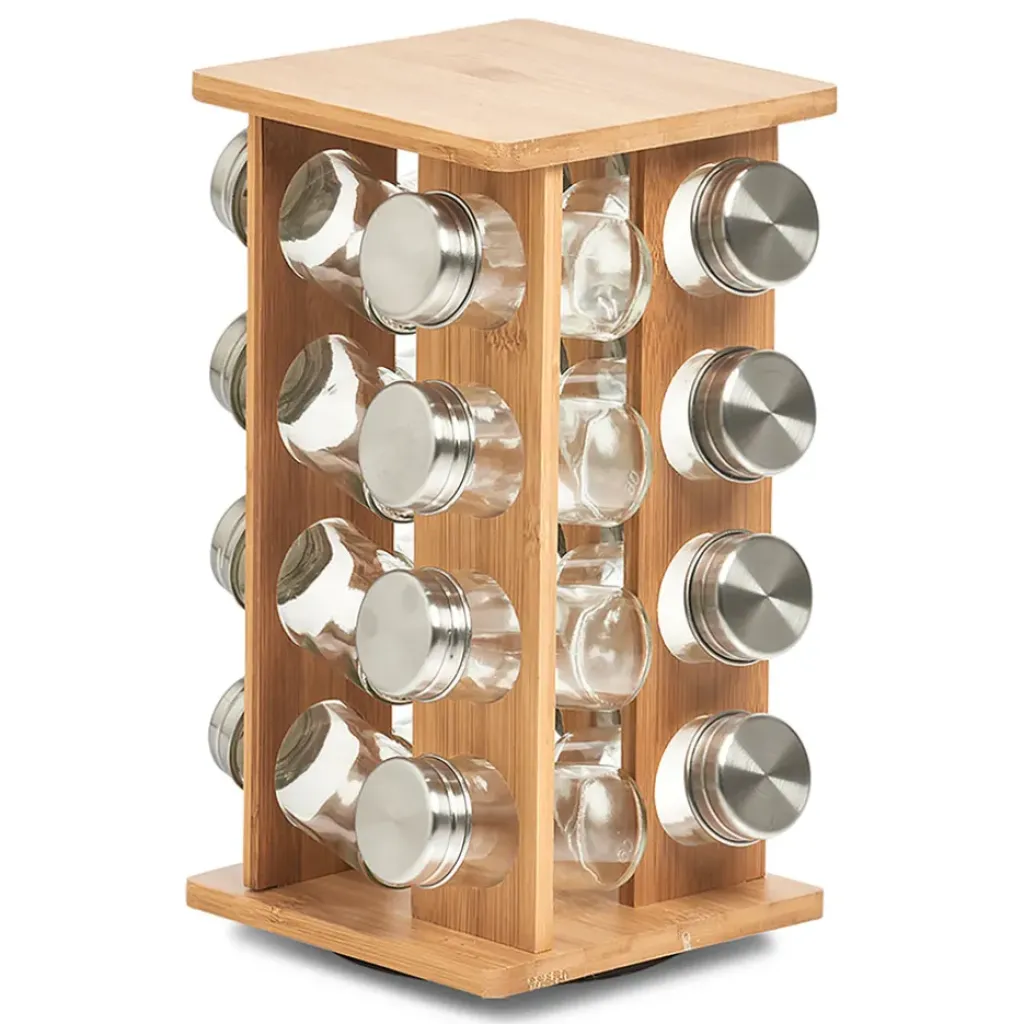 Ce porte-épices accueille 16 bocaux en verre, vous permettant de garder vos herbes et condiments préférés à portée de main tout en ajoutant une touche naturelle à votre décoration intérieure.
