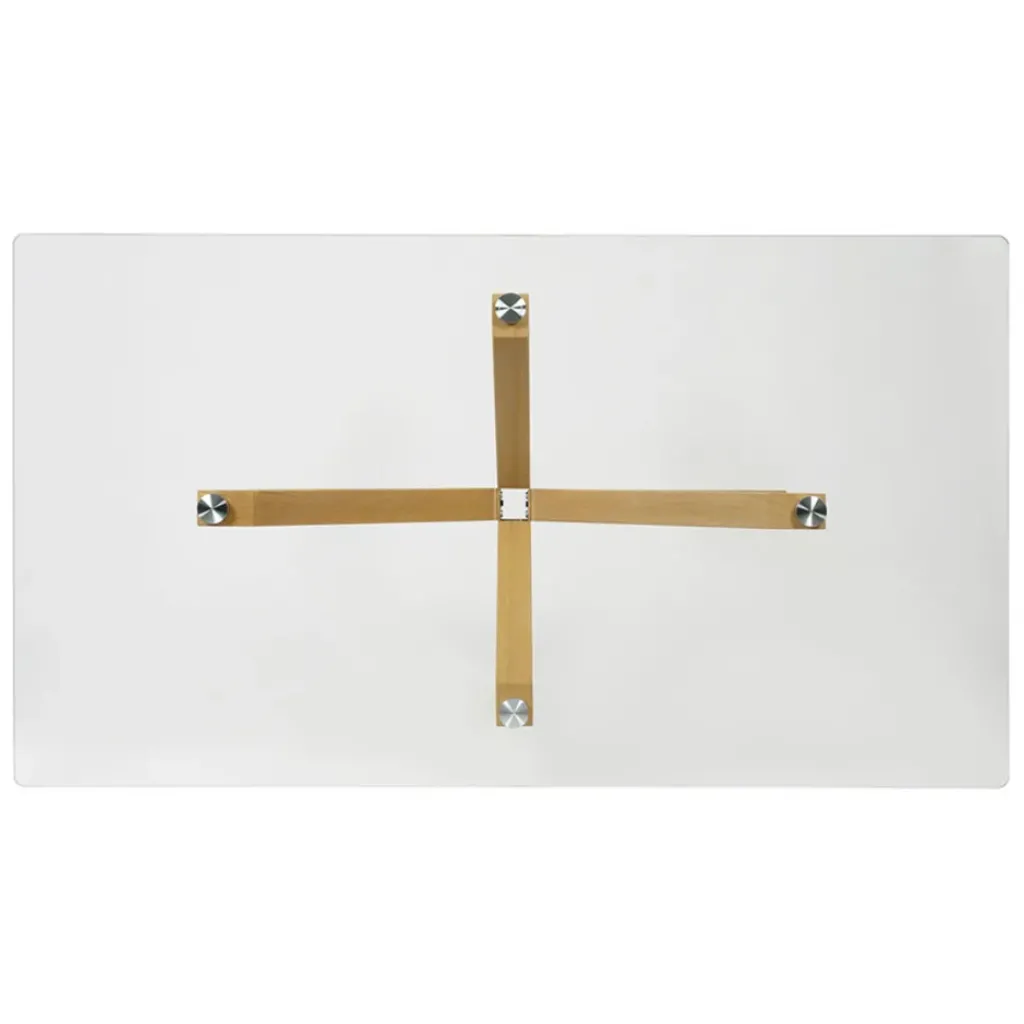 Cette pièce maîtresse allie un plateau en verre trempé solide à une structure en métal naturel, créant un mélange attrayant de durabilité et de design épuré.
