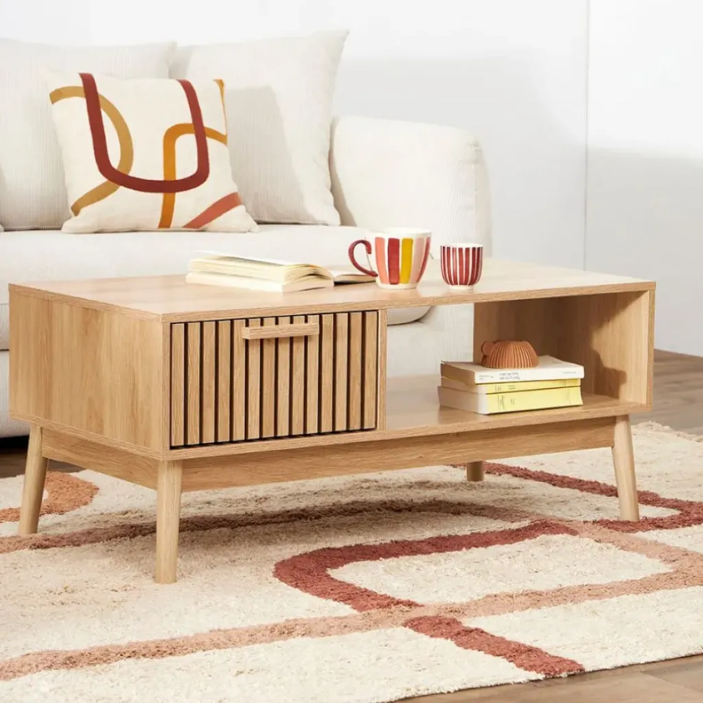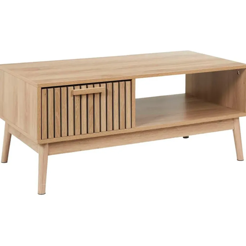 Dotée d’un grand casier ouvert et d’un tiroir en lattes de bois, cette table basse vous offre un espace de rangement astucieux pour vos magazines, télécommandes ou objets déco.
