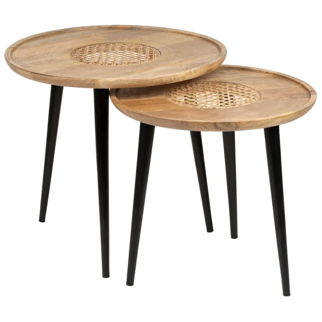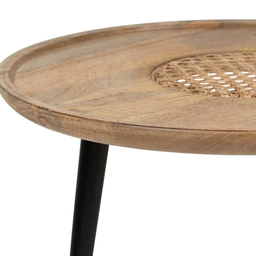 Nos tables basses gigognes Balamaé présentent un plateau en bois de manguier et rotin avec des pieds en métal noir.