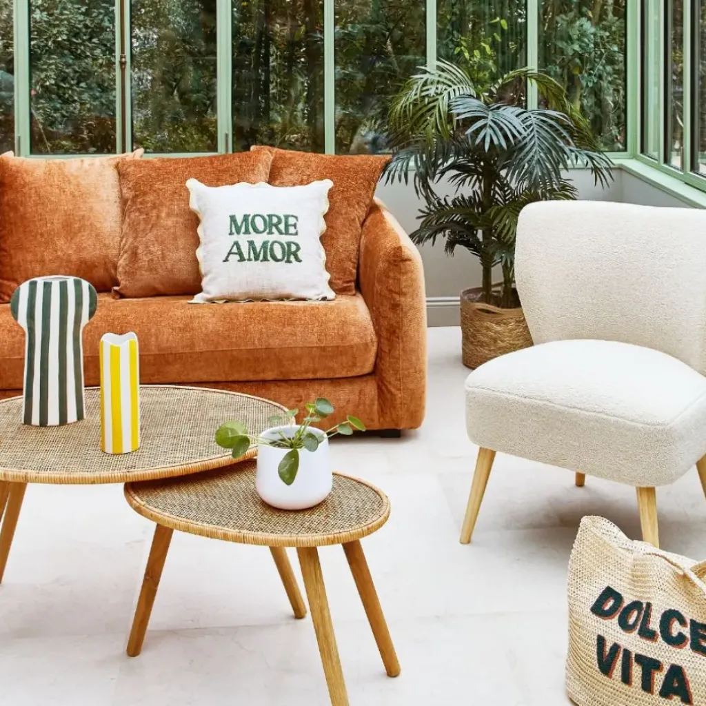 Utilisez-les ensemble comme une paire de tables d’appoint, ou séparément pour créer des zones de détente distinctes dans votre salon.Rotin + contreplaqué