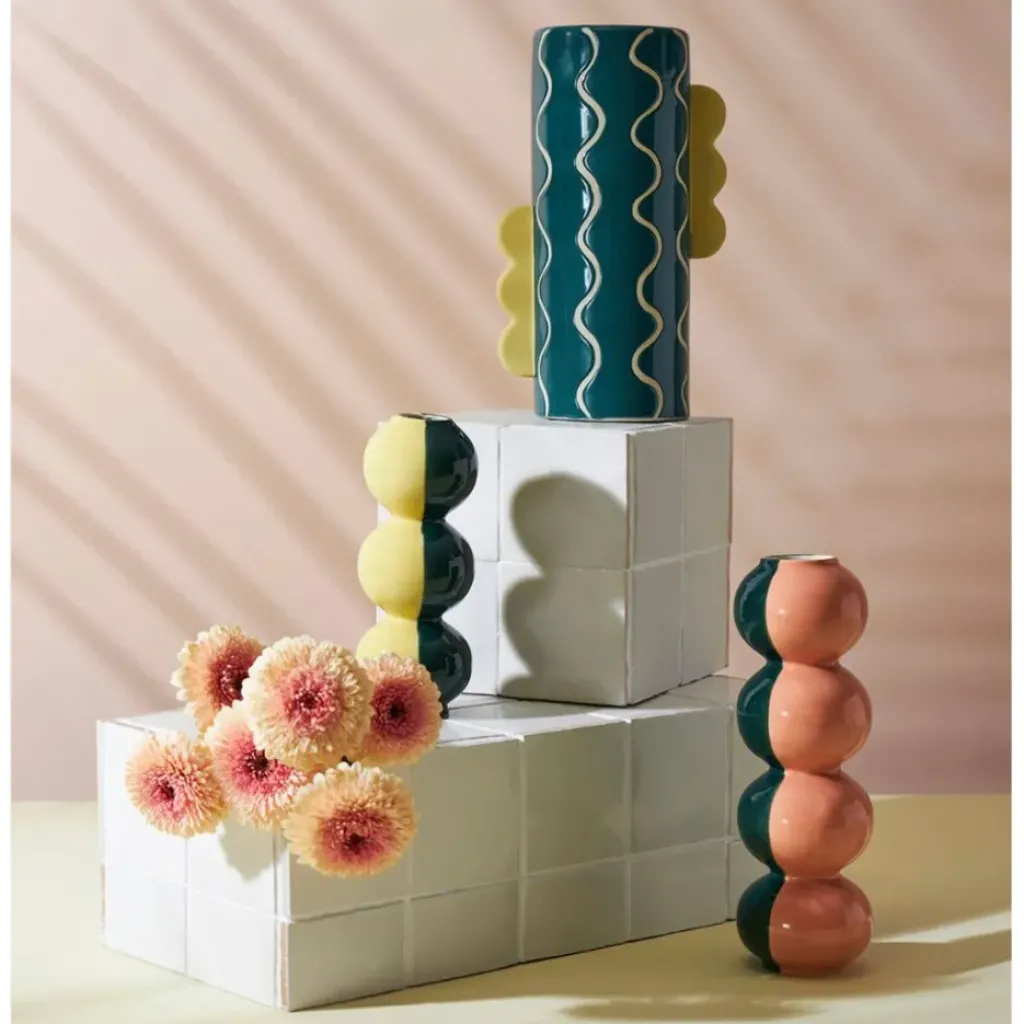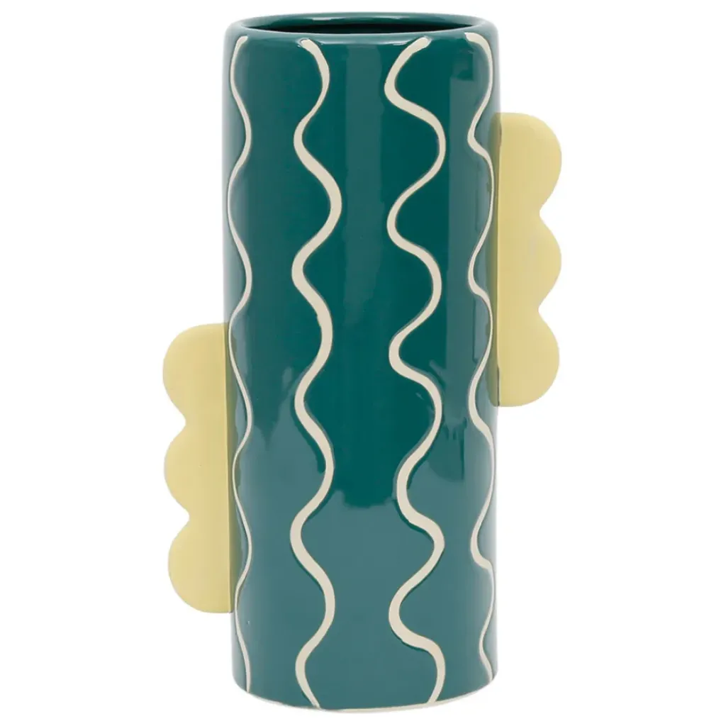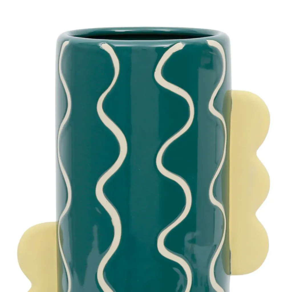 Apportez une touche d’originalité et de modernité à votre maison avec le Vase cylindrique en grès émeraude et jaune Lumi.Grès