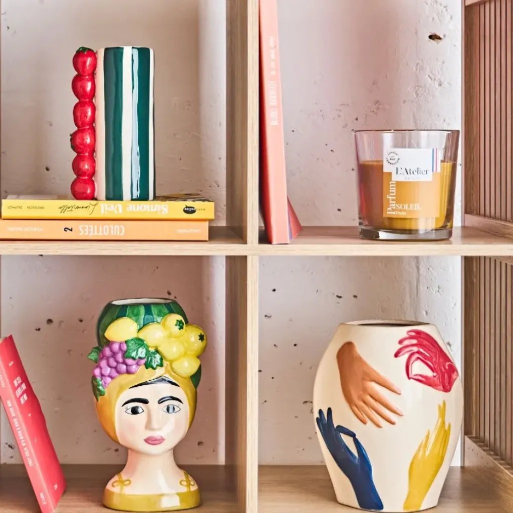 Découvrez le charme irrésistible de notre vase multicolore en forme de main tenant un visage, une véritable œuvre d’art qui apportera une touche artistique à votre intérieur.